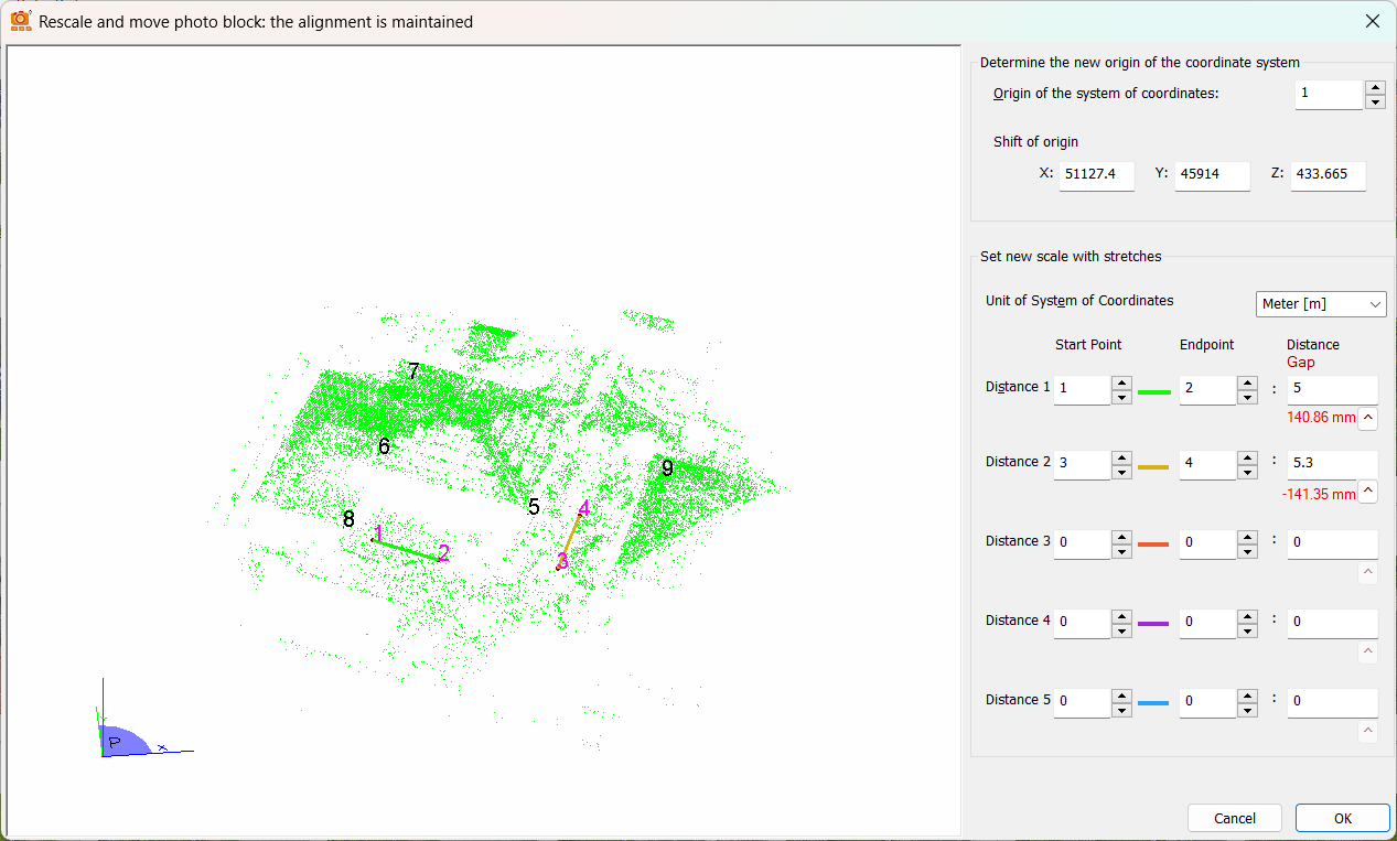 As with the definition of a local coordinate system, the photo block can be rescaled using at least one known distance. If the distances contradict each other, the gaps are also marked in red.