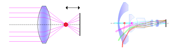 All light rays converge at the focal point. Many types of lenses have two camera constants because the light rays converge on a line; the camera constants are then the front and rear points of this line.